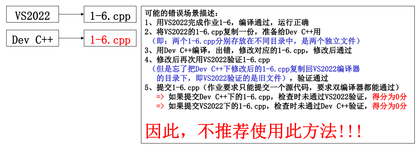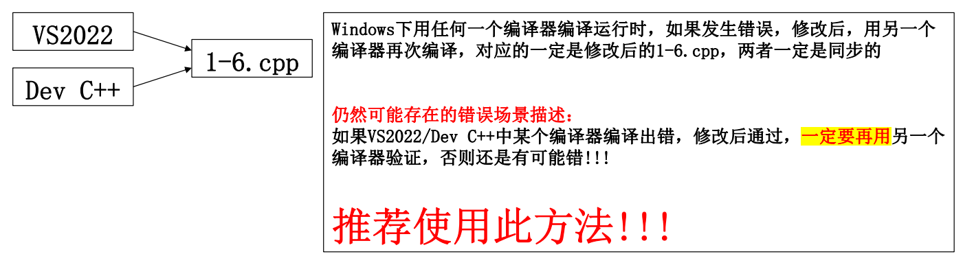 VS 2022 和 Dev C++ 编译器对应同一个1-6.cpp,不会发生忘记同步的问题