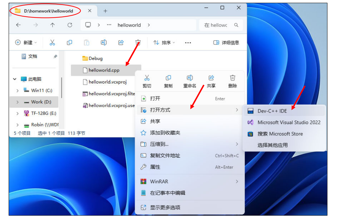 在 "helloworld.cpp" 文件上按鼠标右键 - 菜单中选择"打开方式" - "Dev-C++ IDE"