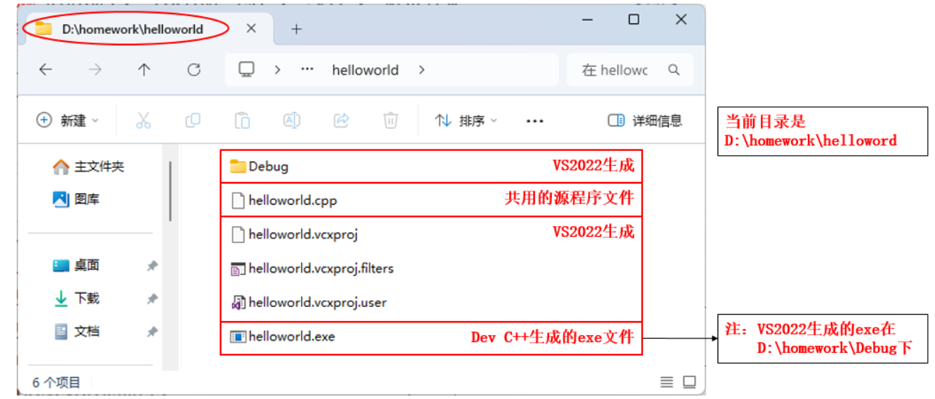 - 本文方法生成的可执行文件 "helloworld.exe" 与源程序文件 "helloworld.cpp" 在同一目录下(Dev C++ 仅生成这一个文件)
